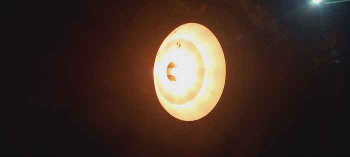 A light fixture glows in a dark room. The fixture is round with a bright center surrounded by concentric rings of light. The color of the light is warm, leaning towards orange. The bulb itself is visible, appearing as a small, bright element in the fixture's center. The dark background provides high contrast, emphasizing the fixture's radiance. The light cast reveals a few dark spots on the fixture surface.