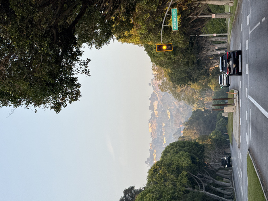 The image depicts a street scene on Rexford Drive in Beverly Hills, California, United States. The perspective is looking down the road towards distant hills. In the immediate foreground, an asphalt road with white lane markings, including crosswalks, occupies the bottom half of the frame. A narrow grassy median separates the lanes, containing two vertical wooden posts. Three vehicles are visible on the road. A black SUV, possibly a BMW, is positioned in the right lane, facing away from the viewer, with a sticker on its rear window. Behind it, a white SUV is also heading away. Further down the left lane, a dark-colored vehicle is approaching the camera's position. No individuals are visible. On the right side of the road, a yellow traffic light is illuminated, suspended above a green street sign that reads "REXFORD DR" in white text. Both sides of the road are lined with dense, mature trees forming an avenue. The trees on the left side have distinct light-colored trunks and dense green canopies. In the mid-ground, the tree-lined road continues into a valley, and the distant background features a range of hills. Numerous large residential structures, appearing illuminated, are visible scattered across these verdant hillsides, which are under a hazy, pale blue sky. The lighting suggests either early morning or late afternoon.