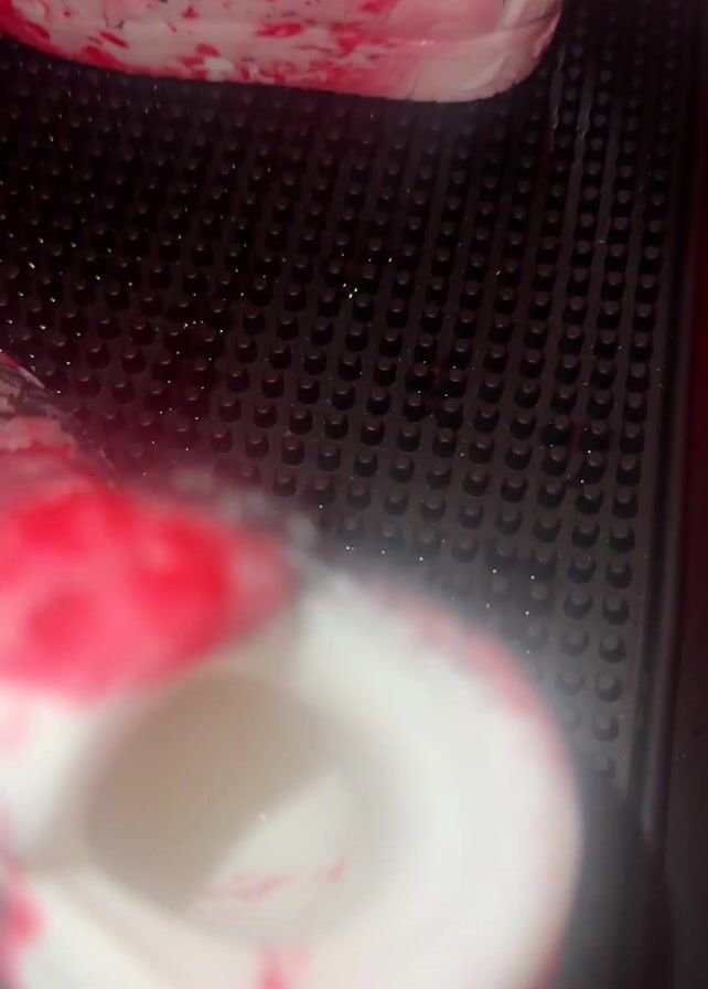 several red and white clogs on a black, perforated surface. The clogs are slightly blurred and appear wet. The background is dark and indistinct. The camera moves around the clogs.