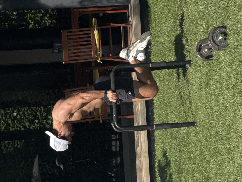 A muscular man wearing a white baseball cap performs a hanging exercise on parallel bars. His feet, adorned with On sneakers and white socks, are raised toward his chest. The backdrop features a wooden chair set, verdant greenery, and manicured grass with scattered weights. The scene is bathed in natural light.