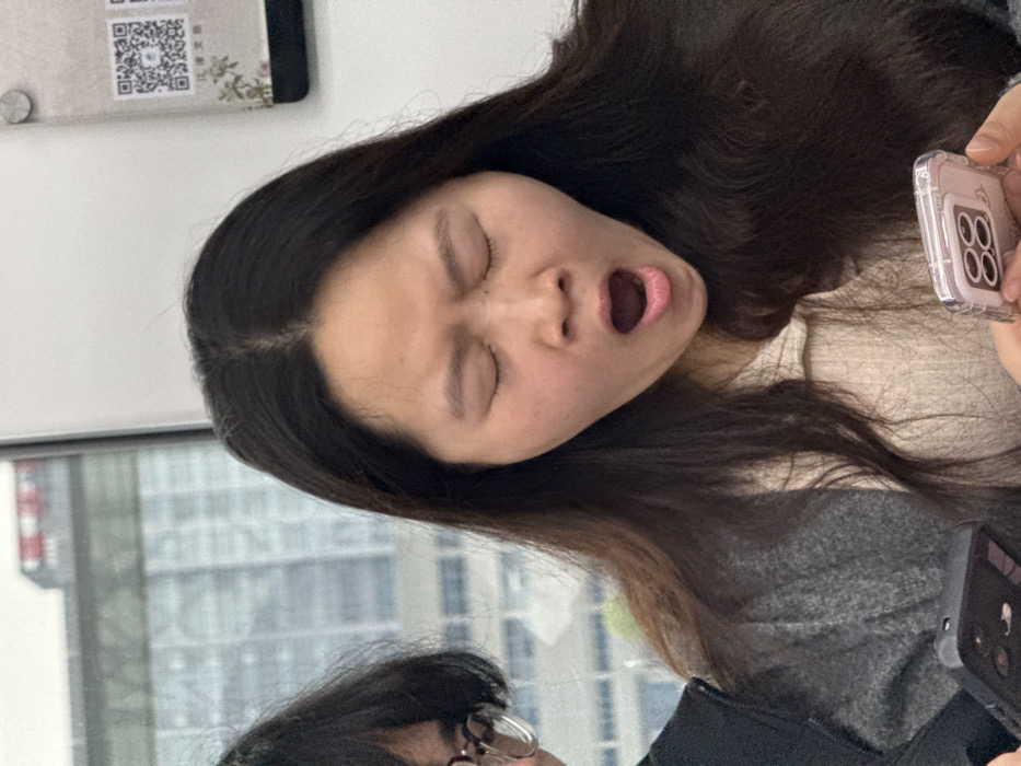 The scene is set indoors in the city of Tiaodeng, China. A female with long, dark hair, parted in the middle, occupies the central foreground. She is in the process of yawning, with her mouth wide open and her eyes squinted shut. She wears a light-colored, possibly beige, collared top underneath a grey outer garment. Her right hand, partially visible, holds a smartphone encased in clear plastic. To her left, the partial profile of a second individual with short dark hair and eyeglasses is visible. This person wears a dark garment and holds a dark-cased smartphone in their left hand. The background includes a large window revealing multi-story urban buildings under a bright, likely overcast, sky. To the upper right, a light-colored wall features a sign or menu adorned with multiple QR codes and Chinese text.