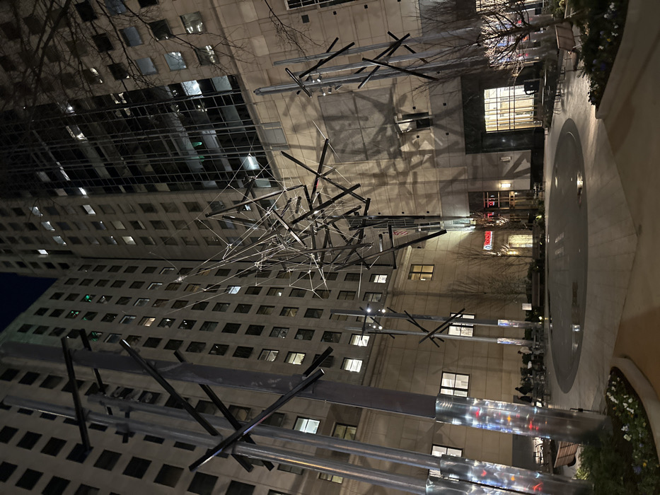 An abstract sculpture of tangled silver rods and wires hangs in a courtyard. Tall buildings surround the courtyard, reflecting light from numerous windows. The ground is paved with light-colored stone. In the distance, there are signs and some greenery. The scene is at night, with the sky visible as a dark hue. The overall impression is urban and modern.