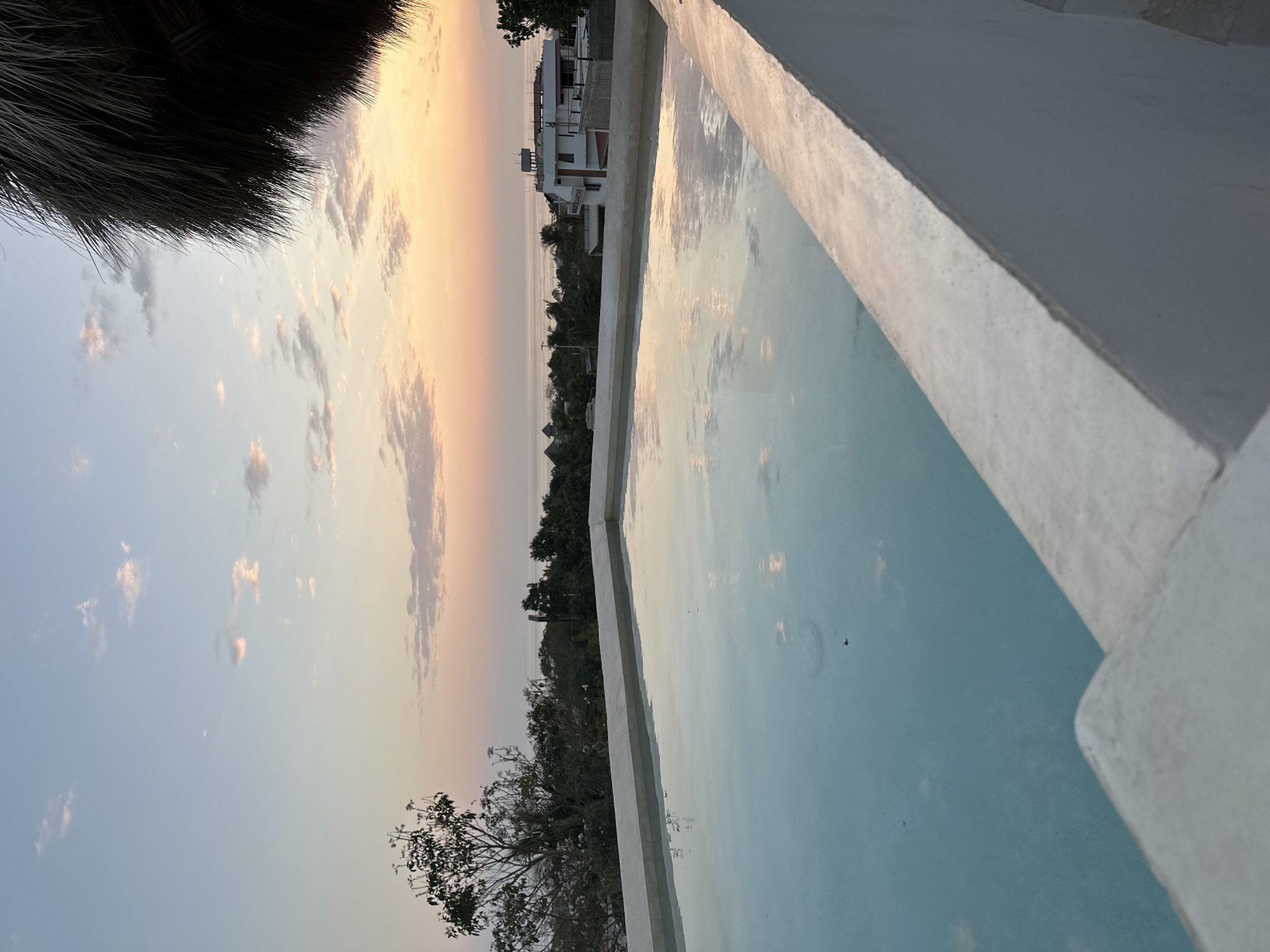 swimming pool in Brisas de Zicatela, Mexico, with a sunset reflected in the water