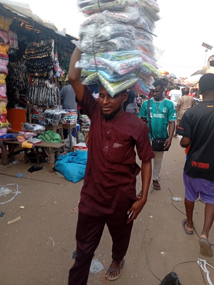 A man carries a stack of wrapped fabrics on his head in a bustling outdoor market. He wears a burgundy tunic and trousers with sandals. Other people walk by, including one in a green jersey and another with a black shirt and purple shorts. The market has stalls with various goods, and the ground is littered with debris. The overall atmosphere suggests a busy commercial area with many people and products.