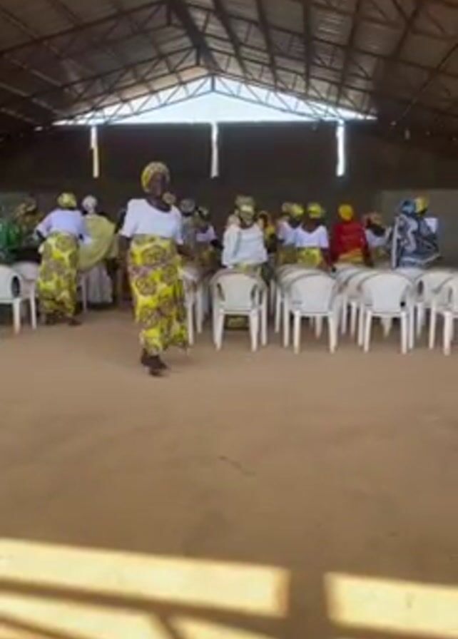 Inside a building with a light brown dirt floor and a high roof, a group of women, primarily wearing white shirts and yellow patterned skirts with matching head wraps, are dancing and singing. White plastic chairs are arranged in rows around the space. One woman, standing in front of the chairs, leads the dance with expressive hand gestures and footwork. The environment appears to be a community hall or church, bathed in natural light.