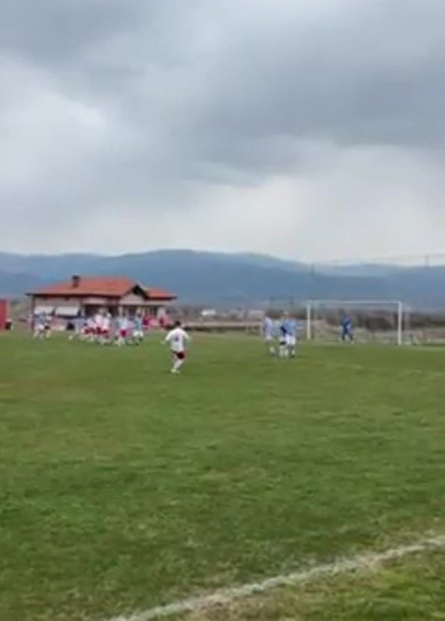 A soccer game is in progress on a green field, under a cloudy sky with mountains visible in the distance. A player in a white and red jersey kicks a soccer ball toward the goal, where players in blue jerseys are positioned as defenders. A referee is also present on the field. A building with an orange roof is visible in the background. The ball is in the air after being kicked.