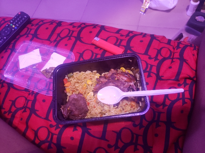 An overhead view captured in Okpanam, Nigeria, displays a take-out meal and associated items on a red fabric surface with black patterns