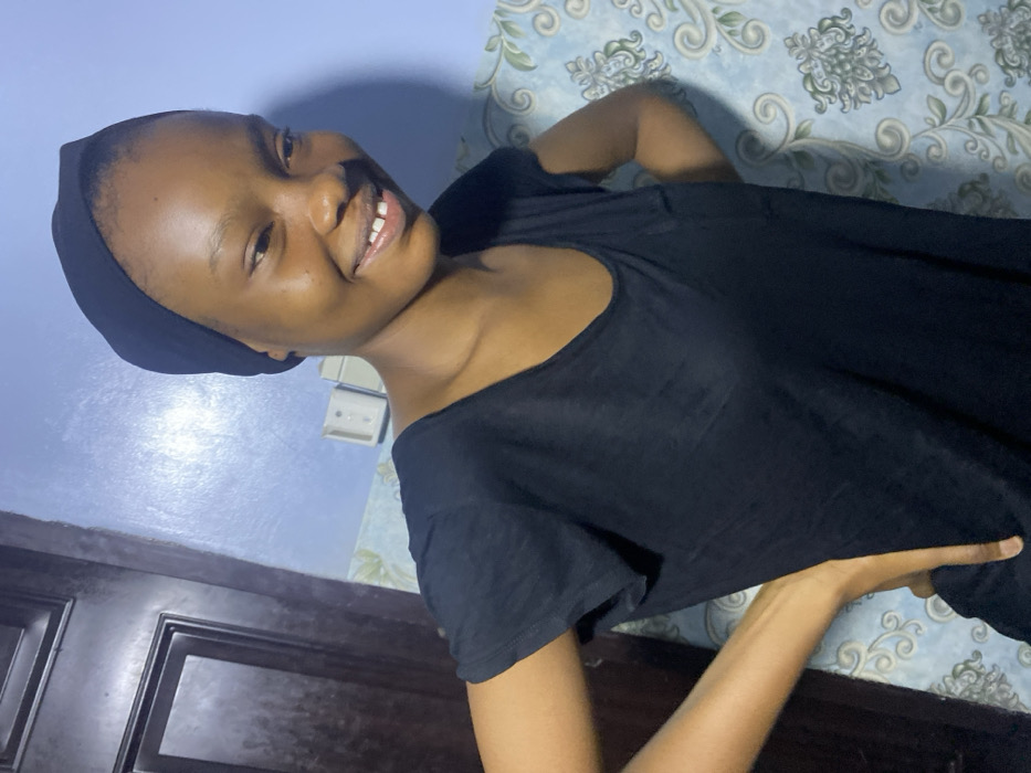 A smiling young woman wearing a dark head covering and a dark top is captured in a close-up shot