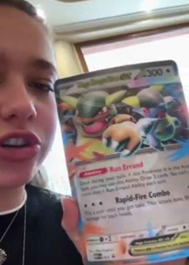 young woman holding up an oversized Pokemon card of Dugtrio. She claims it is bigger than her face, then quickly pivots to show another person holding up two more oversized Pokemon cards of Dugtrio.
