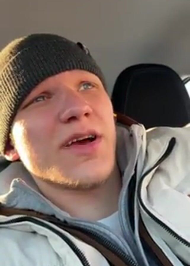 Here is a brief description of the video: A young man is sitting in a car, wearing a gray beanie, a hoodie, and a white puffer jacket