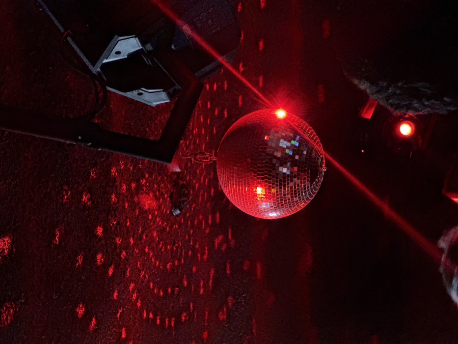 A disco ball hangs in a dark space, bathed in red light