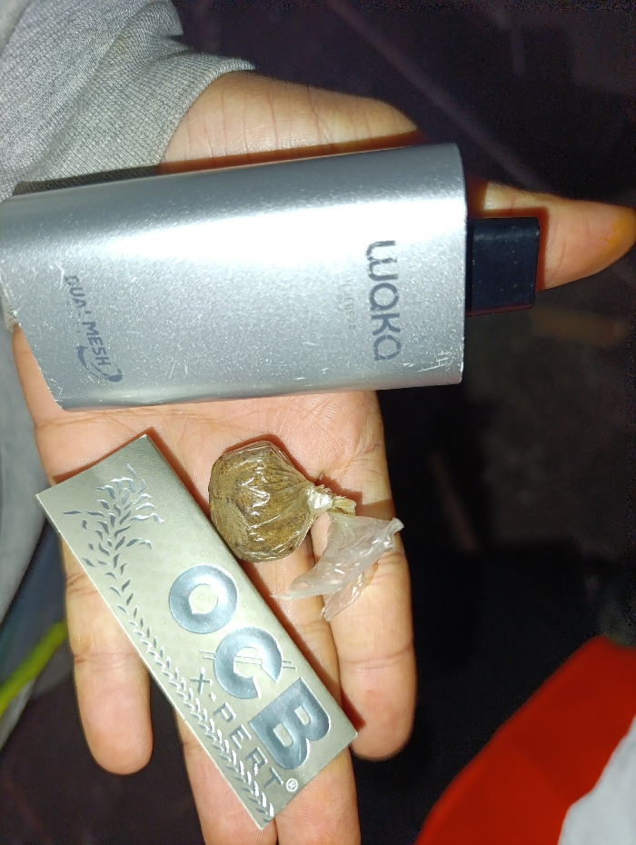 A close-up, top-down view depicts an individual's right hand holding three distinct items in the city of Salé, Morocco. The hand, displaying a medium-brown skin tone, is partially covered on the left by a light grey sleeve. In the upper part of the hand, a silver-colored "waka DUAL MESH" vaping device, featuring a black mouthpiece, is held horizontally. Below this, positioned diagonally towards the lower left, is a silver packet of OCB X-PERT rolling papers, which includes a decorative wheat-stalk design. Adjacent to the rolling papers and situated centrally within the palm is a small, spherical mass of brownish-green substance, consistent with cannabis resin, wrapped inside a crumpled, transparent plastic baggie. The background is dark and out of focus, with a blurred red object visible in the lower right quadrant.