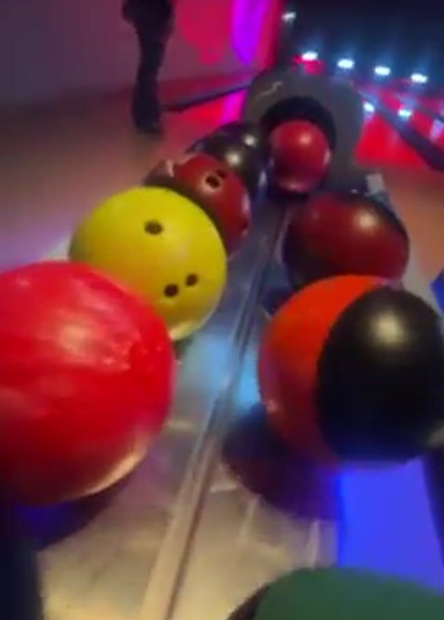 bowling alley with bowling balls lined up in the ball return mechanism. The camera is positioned low, looking up the lane. There are red and white glowing lane markers visible, and overhead monitors displaying scores. A person walks in the background towards the lane. The lane is illuminated with red and blue lighting. A sign saying “BAD BOWL” is visible.