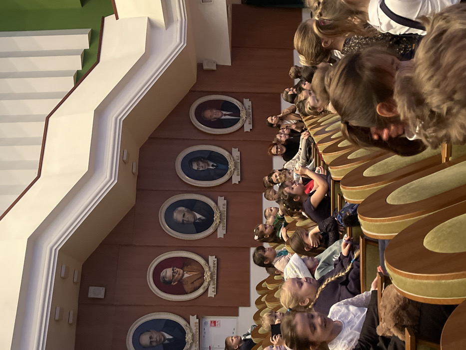 A group of children sit in an auditorium with wooden seats. Framed portraits adorn the wall, depicting stern-looking men. A staircase is visible on the left. The scene is well-lit and appears to be an educational or cultural outing for the children. They are seated, attentive, or engaged with something in front of them. The overall composition suggests a visit to a historical or performance venue.