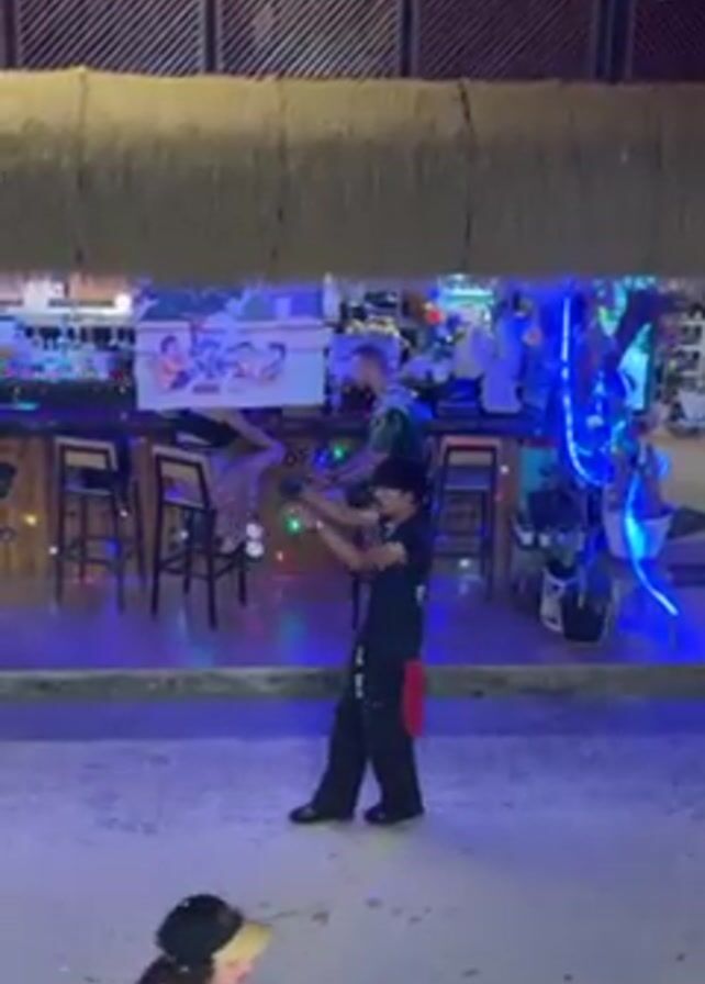 scene at an outdoor beach bar at night. A young person in a black t-shirt and black pants is performing with what appears to be a light-up ball. They are standing on a concrete area in front of the bar. The bar has a thatched roof, wooden decorations, and blue lights. There are stools at the bar, and several people can be seen sitting and standing behind it. Pedestrians, including couples and small groups, walk past the performer on the concrete walkway. The overall lighting is dim, with colorful lights illuminating the bar area.