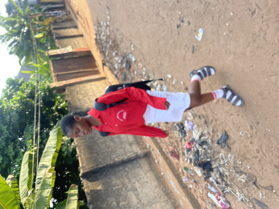 A young person in a red long-sleeved shirt and white shorts walks along a dirt path strewn with litter. They wear sandals with pink socks and carry a backpack. Lush green foliage is visible to the left. The scene suggests a developing country with environmental challenges. The person is walking toward the viewer, head slightly down. The composition is tilted.