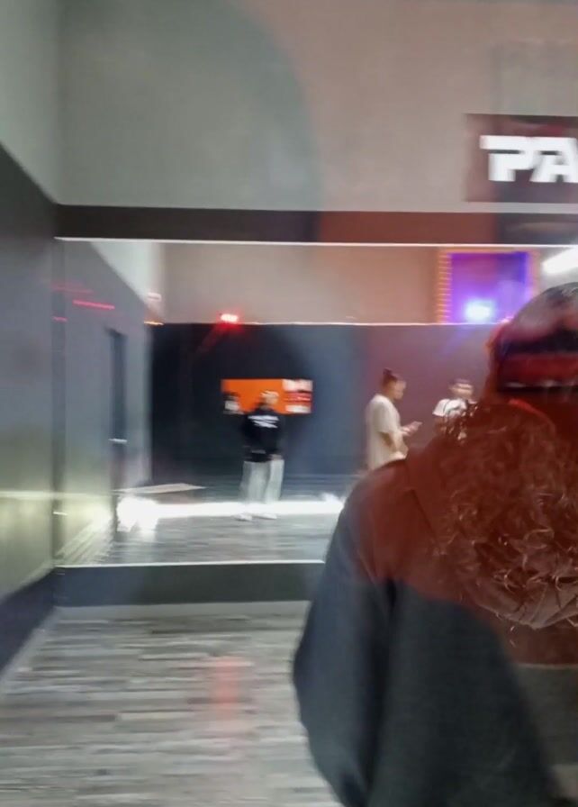 n indoor dance studio named "PANDAWANT," with several people present. The camera appears to be handheld and slightly shaky, positioned behind a person wearing a dark hoodie, who is walking toward the center of the room. There are several people standing in the background, some looking at their phones, and others appearing to be dancers stretching or preparing to practice in front of large mirrors partially covered by blue curtains. The room has gray walls with black trim, and the floor is made of light-colored wood-look planks. The lighting appears to be a combination of natural and artificial light, with some bright spots and reflections visible. The audio includes some music playing.