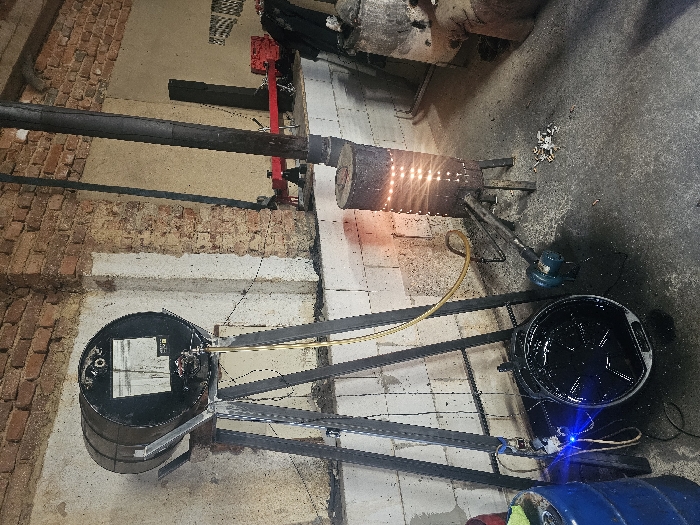 The image displays an indoor scene, likely a workshop or utility space, situated in Všeruby, Czechia. The environment features walls composed of exposed red brick and sections of weathered plastered concrete, with a concrete floor exhibiting dark stains and scattered debris. On the left, a large black metal barrel is horizontally mounted on a custom-fabricated metal tripod stand. Labels are affixed to the side of the barrel. A yellow flexible hose connects from a valve located at the bottom of the barrel. Directly beneath this, a black plastic tub rests on the floor, containing a dark, viscous liquid. A pump or motor unit, emitting a blue light, is positioned near the tub, connected by hoses, indicating a fluid transfer system. A blue industrial drum is partially visible on the far left. To the right, a cylindrical metal stove, appearing to be of a homemade design, is actively burning. Intense orange-red light glows from multiple horizontal perforations along its side, signifying active combustion within. A black metal chimney pipe extends vertically from the top of the stove, exiting the frame. A turquoise electric blower unit is positioned on the floor, connected to the lower section of the stove by a metal pipe, presumably supplying forced air. A small collection of metallic scrap or ash is visible on the floor adjacent to the stove. In the background, against the wall, a red mechanical jack or lifting device is discernible, alongside other indistinct objects and dark draped material. No individuals are present in the scene. The overall arrangement suggests an improvised system for heating or processing liquid, potentially waste oil, utilizing the barrel stove.