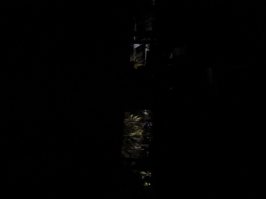 Two narrow, dimly lit openings punctuate the dark scene. The top opening reveals fragments of a building exterior, foliage, and glimpses of sky. The lower opening displays more dense greenery, suggesting a garden or foliage arrangement, with hints of a structure behind it. The overall impression is a night scene viewed through obscured windows.