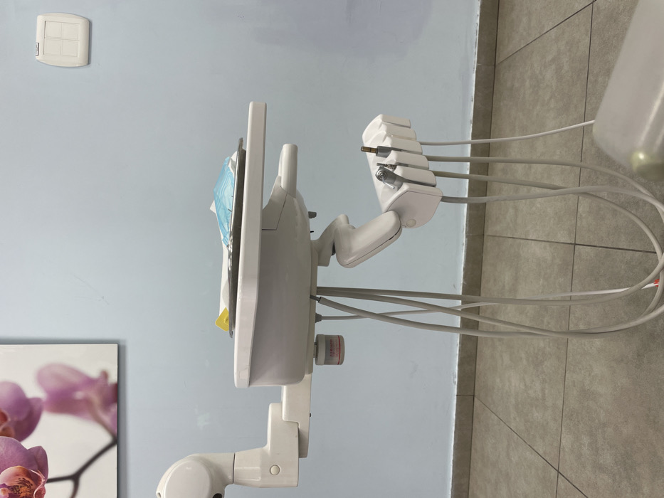A dental workstation is shown from a side angle