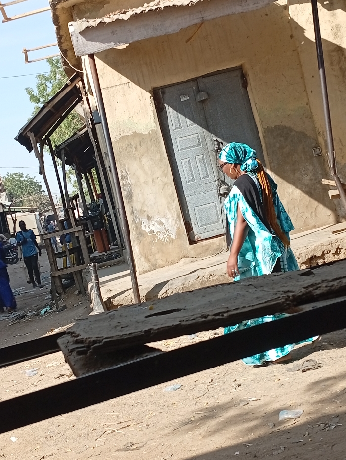 The image captures an outdoor street scene in Kofar Ruwa, Nigeria, under bright sunlight