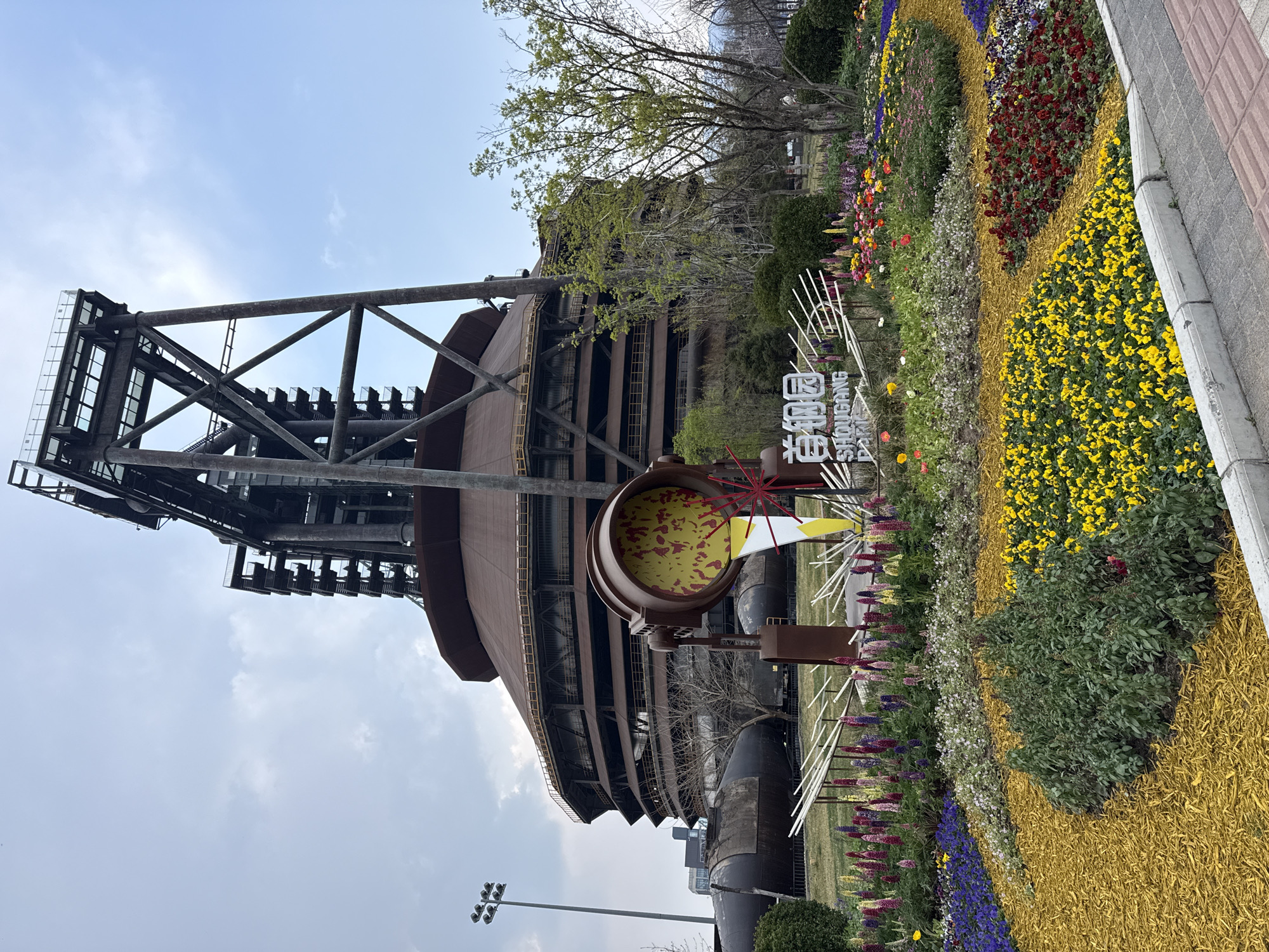 The image captures a view in the Shijingshan District of Beijing, China, specifically at the Shougang Park, a former steel mill site. The focal point is a large, rusted industrial structure, likely part of the old Shougang steelworks. This structure consists of a tall, skeletal metal framework supporting a multi-tiered, dome-shaped building. In the foreground, there's a decorative sign in Chinese and English, reading "Shougang Park," surrounded by a colorful flower bed. The flower bed is arranged in distinct sections, featuring a variety of flowering plants. In the middle ground are other industrial remnants, like large pipes. The sky is partially cloudy.