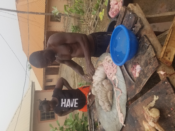The scene takes place in Pati Ridge, Nigeria, at the coordinates 7.81 latitude and 6.704 longitude. A man is preparing meat on a table in a residential backyard. He is shirtless and wearing dark pants. He is using a large knife to cut and prepare meat. There are various cuts of meat on the table including large sections of intestines, and a blue basin of water. A woman is standing behind the man wearing a black shirt that says “HAVE” on it, with orange shorts and a dark colored headscarf. There is another building behind the man, with an orange corrugated metal roof. The buildings are in various states of construction and have exposed brick walls. The ground is dirt and some areas are overgrown with weeds. There is a small tree behind the woman. The weather is overcast.