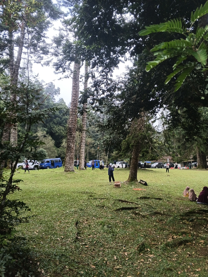 The scene is set in a natural park or recreational area within the city of Munyati, Zimbabwe, under an overcast sky. A large grassy field extends from the foreground to the mid-ground, surrounded by numerous tall trees with varied foliage and bark textures. Approximately 15-20 individuals are present. In the mid-ground, a person wearing a dark blue jacket and light pants stands near a tree, bending towards a brown box-like object on the ground. To their immediate right, three individuals are seated on the grass, two wearing light-colored headscarves and one in a dark red garment. Further in the mid-ground and background, multiple vehicles are parked, including two blue vans (one with an open side door) and a white SUV. Other individuals are dispersed among the trees and parked vehicles, some standing in small groups. The foreground shows patches of sparse grass, exposed tree roots, and scattered dry leaves. Dense tree cover forms the background.