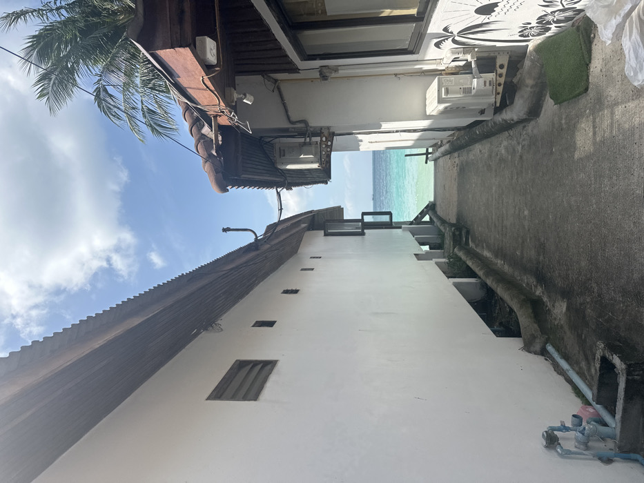 A narrow alleyway leads to a glimpse of a turquoise ocean under a bright sky. Buildings flank either side of the alley. The building on the left is white with a sloping, corrugated roof. The building on the right has air conditioning units and a decorative, mural-like design. Vegetation, including a palm tree, extends from the upper left corner. The alley floor is concrete, showing signs of wear.