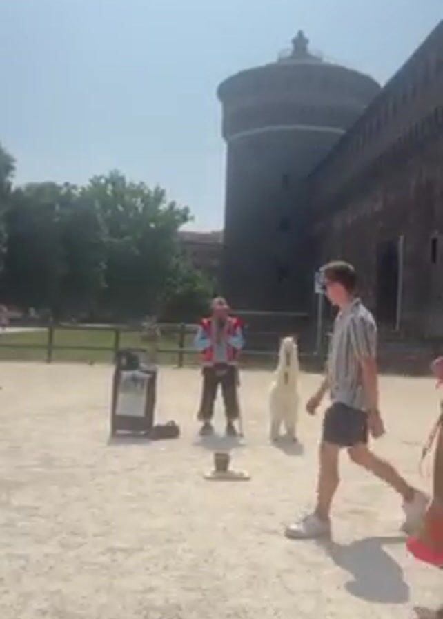 n outdoor public space in front of a large, dark-colored castle tower. The ground is covered in light-colored gravel or sand. A street performer dressed in a bright orange vest, pants, and a hat is standing in the center of the frame, along with a figure in a white, almost snowman-like costume. A variety of people, including tourists, are walking past the performance area. The scene appears to be a tourist destination, given the castle tower and the presence of numerous visitors. The sky is clear and bright, suggesting a sunny day.