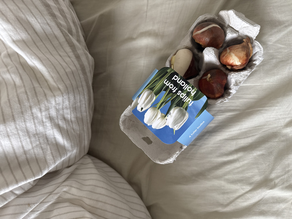 - "The image displays a white paper pulp egg carton containing four tulip bulbs" by FM-ZsM8w2, licensed under CC BY 4.0
