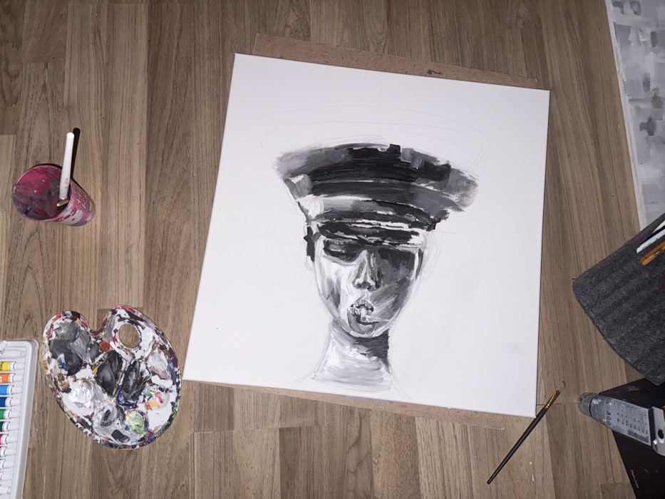 This image depicts an overhead view of an art workspace located in Kozloduy, Bulgaria. A large white canvas, oriented vertically but displaying a sideways monochrome portrait, occupies the central area. The portrait, rendered in various shades of black, white, and gray with visible brushstrokes and faint preliminary pencil outlines, shows a figure's head tilted backward, appearing to look upwards. To the upper left of the canvas, a well-used white plastic art palette, stained with a mix of dried and wet colorful and grayscale paints, is present. Adjacent to the palette, a white plastic tray containing a linear arrangement of small, colorful paint tubes is visible. To the upper right, a pink cylindrical container holds several brushes or pencils, with one white-handled tool extending horizontally from it. A single paintbrush with a black handle and light bristles rests on the lower left corner of the canvas. Below the canvas, partially visible items include a tube of gray paint, a dark gray rectangular sponge or cloth, and a collection of colorful pastel sticks. The entire scene is arranged on a light brown wooden floor composed of horizontal planks, with a section of a light gray baseboard or wall visible at the bottom right. No individuals are present in the scene, implying a current or recently paused artistic activity.