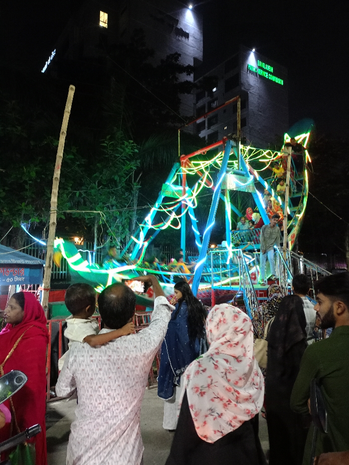 This nighttime image depicts an outdoor gathering or fair in Dhaka, Bangladesh, set against the backdrop of the Bangladesh Public Service Commission building. **Location and Environment:** The scene unfolds at night, illuminated by artificial light sources. A multi-story building is visible in the background, bearing the illuminated green English text "BANGLADESH PUBLIC SERVICE COMMISSION." This places the location in Dhaka, Bangladesh. The foreground and mid-ground comprise an open, unpaved area likely hosting an event, with sparse vegetation. Overhead wires are present against the dark sky. **Subjects and Objects:** * **Amusement Ride:** Dominating the mid-ground is a large, brightly lit swinging amusement ride, resembling a "pirate ship." Its structure is extensively adorned with multicolored LED lights, primarily in blue, green, yellow, and pink/red. The boat-shaped gondola is in motion, actively swinging, and contains approximately 10-15 individuals, including adults and children. * **People (Foreground/Mid-ground):** * In the immediate foreground, a man, viewed from behind, holds a small child on his left shoulder. The man, wearing a light-colored, patterned long-sleeved shirt, extends his right arm, holding a mobile phone horizontally, directed towards the amusement ride, suggesting he is capturing media. The child wears a light-colored shirt. * To the man's left, a woman in a red head covering is partially visible. * To his right, a woman with long dark hair, dressed in a dark blue garment with white patterns, stands facing right. Behind her, a woman wearing a white hijab with a pink floral pattern is visible. Further to the right, a man with a beard, wearing a dark shirt, is partially visible. * Numerous other indistinct individuals are present around the base of the ride and throughout the scene, suggesting a crowd of spectators or attendees. * **Other Objects:** A tall, slender bamboo pole stands vertically in the left foreground. A small blue stall or booth with partial Bengali text is visible to the left of the ride's base. **Actions and Interactions:** People are observed riding the illuminated swing, while others on the ground are observing the ride. The man in the foreground is actively operating a mobile phone, likely recording the event. The scene portrays a public recreational activity with a visible crowd.