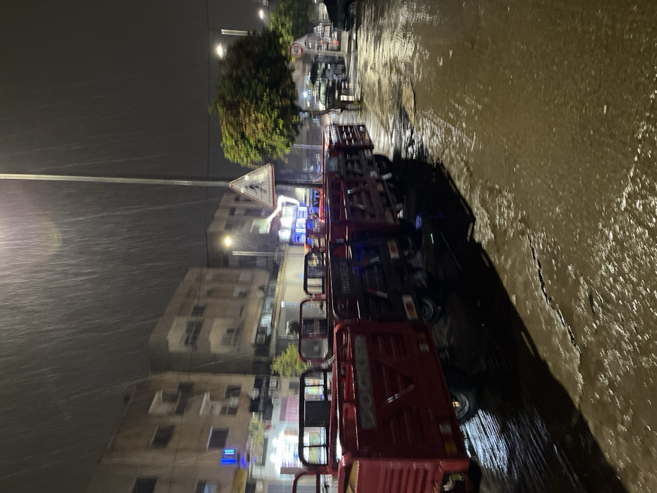 A nighttime street scene shows heavy rain. The road is flooded and reflective. A row of small, red utility vehicles with cargo beds is parked alongside the curb. Buildings stand in the background, illuminated by streetlights, while a street sign and a tree are visible in the midground. The sky is dark, and the overall atmosphere is wet and dreary.