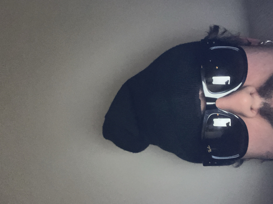 A person wearing a black beanie and sunglasses. The person's face is visible, including their nose and some facial hair. The sunglasses have a reflective surface, showing a light-colored reflection. The background is a plain light gray color. The image is oriented sideways.