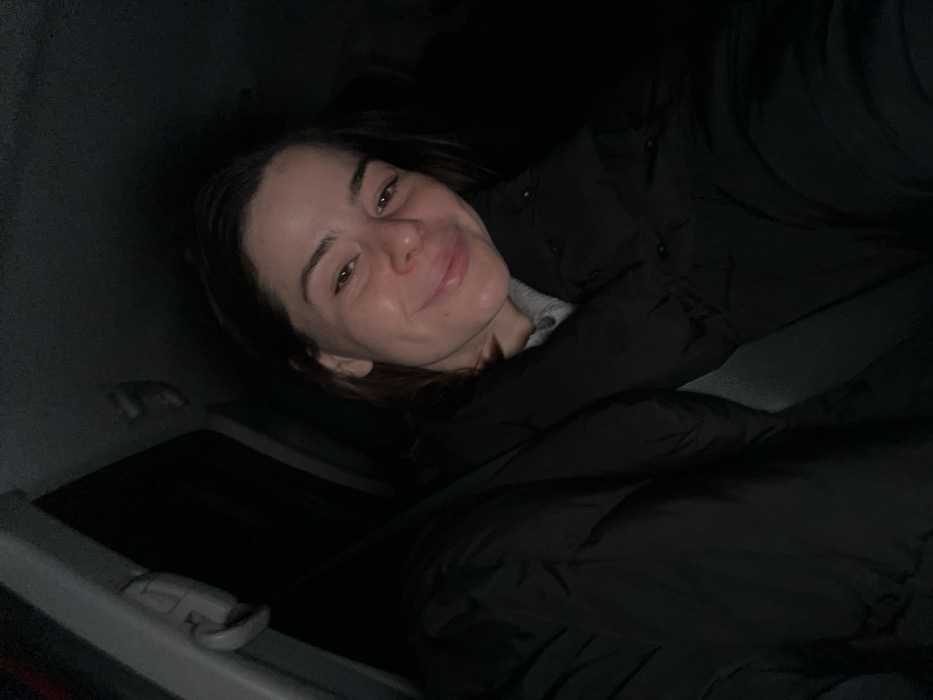 A woman with long brown hair and fair skin smiles towards the camera. She's wearing a black puffy jacket, partially unzipped to reveal a grey shirt beneath. The scene is dimly lit, with much of the background and the woman's clothing cast in shadows. A glimpse of a car interior is visible at the bottom-left corner of the frame, showing a dark window and a small portion of the car's interior paneling.