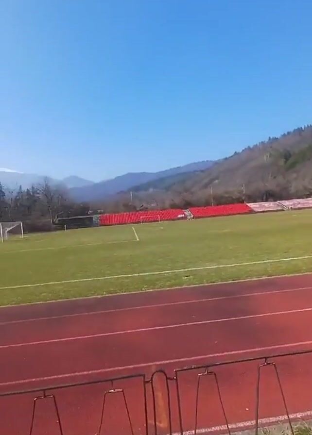 sports field with a red running track and a green soccer field. There are red bleachers on one side of the field. In the distance, there are mountains, some with snow-covered peaks. Three people are walking on the soccer field. The sky is clear and blue. A metal fence runs along the near side of the running track. The environment suggests a rural or semi-rural setting.