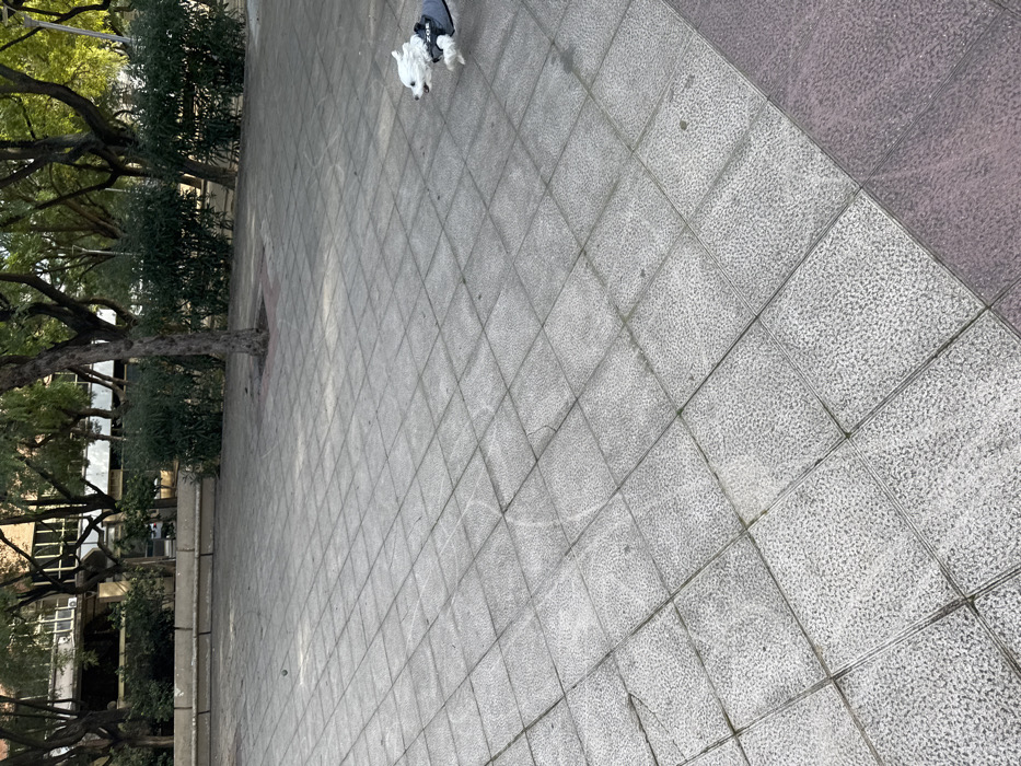 The scene is set in an outdoor public space, likely a plaza or park, in L'hospitalet De Llobregat, Spain. The foreground and mid-ground consist of a paved surface primarily composed of light grey, square concrete tiles with a distinct pebbled texture. A strip of darker, reddish-brown textured tiles is visible along the lower right edge of the frame. Faint, arc-shaped scuff marks are present on several of the grey tiles. In the mid-right area of the image, a small, white, fluffy dog is captured in mid-stride, running rapidly from left to right across the tiled surface. Its fur appears wind-swept, indicating motion. The dog is wearing a dark grey or black harness with the name "ZOE" clearly visible in white lettering on its side. In the upper-left quadrant of the grey paved area, a small, dark, spherical object, approximately 2-3 cm in diameter, is visible on the ground. The background features multiple trees with visible trunks and sparse green foliage, suggesting a temperate climate. Behind these trees and a line of dense green bushes, a light-colored building with several windows is partially discernible. A long, low, light-colored concrete bench or planter edge runs horizontally across the mid-ground, delineating the paved area from the background vegetation. The lighting suggests daytime conditions.