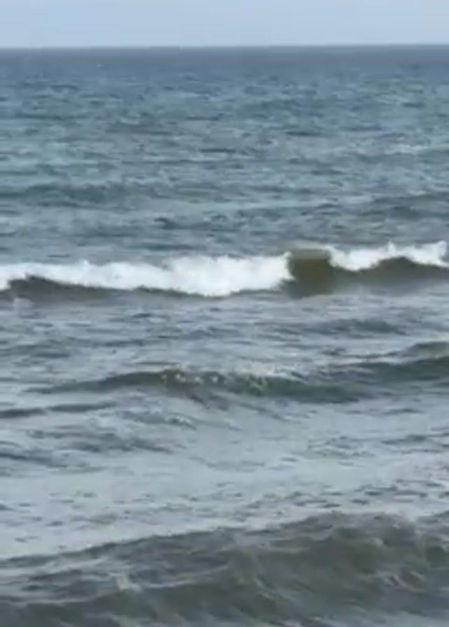 ocean on an overcast day. The water is blue-grey, and small waves are rolling in. The horizon is visible in the distance.