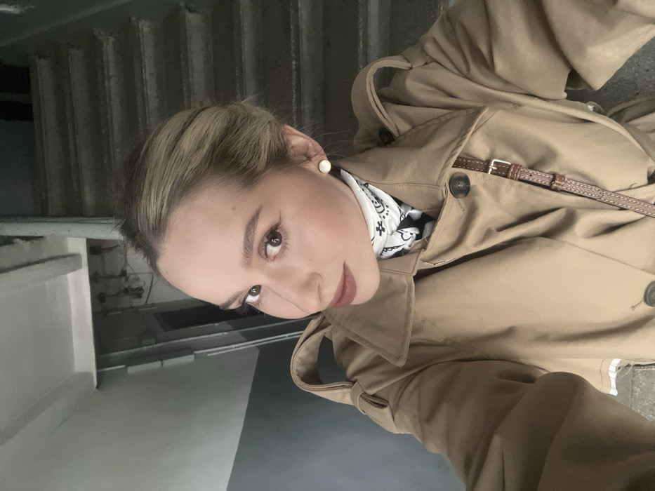 A female individual is captured in a close-up, high-angle selfie, positioned within an indoor stairwell or hallway. She has blonde hair pulled back, brown eyes accentuated with winged eyeliner, and wears reddish-brown lipstick. Her attire consists of a light tan double-breasted trench coat with visible buttons and lapels, a white neckerchief patterned with black motifs, and white circular stud earrings. A brown leather strap, possibly from a bag, crosses her chest. The background reveals a worn concrete or stone staircase ascending on the right. Walls are segmented into a light gray upper section and a darker gray lower section. A partial view of a dark doorway or opening is visible in the upper left background. The environment lacks specific architectural or environmental markers to precisely identify a location within Minsk, Belarus.