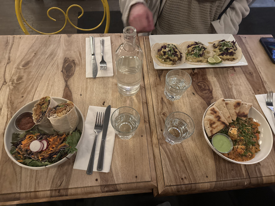 A wooden table is set with two plates of food. One contains a burrito cut in half with a side of salad and salsa. The other plate features an Indian dish with small flatbreads and a green sauce. A second setting consists of three tacos on a rectangular plate. There are two water glasses per setting, plus a water bottle. Silverware and napkins are placed next to each dish. A yellow chair is visible in the background.
