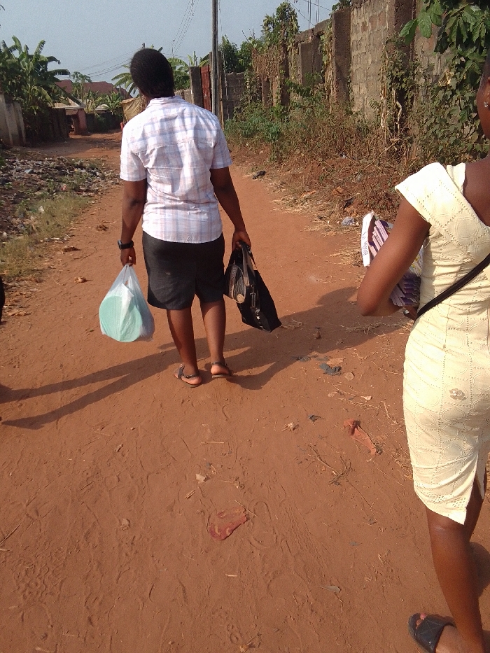 The scene in Ukwu-Abwa, Nigeria, depicts two individuals walking away from the camera along an unpaved, reddish-brown dirt path under bright daylight, casting distinct shadows