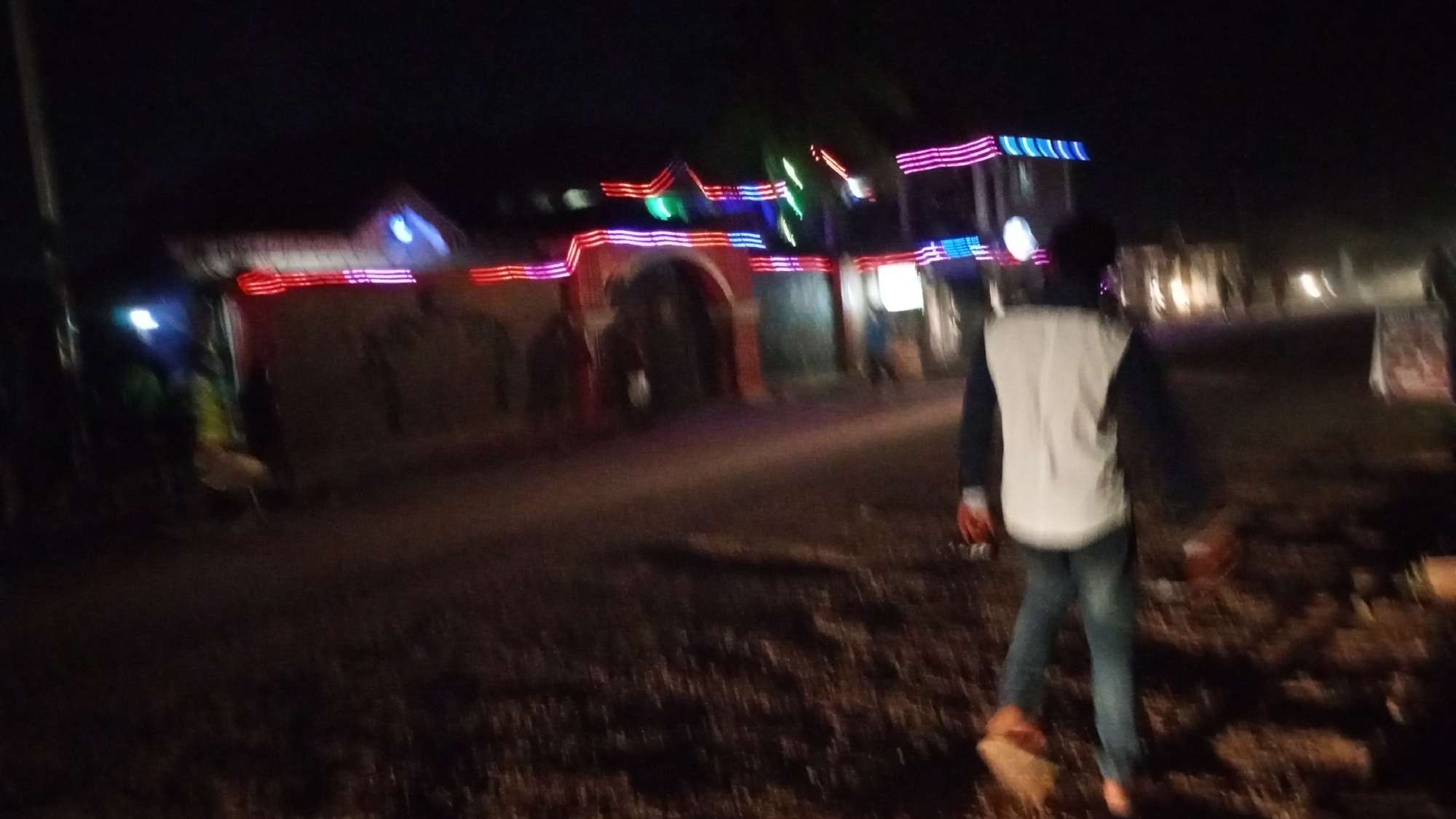 This image depicts a nighttime street scene in Yelwa, Nigeria. The foreground shows an unpaved, textured ground, possibly dirt or gravel, with scattered debris. A person is visible in the right foreground, walking away from the camera, wearing dark long sleeves, a white vest-like garment, blue jeans, and light-colored footwear. The mid-ground features a dark, seemingly paved road. In the background, multiple buildings are illuminated by numerous colorful string lights in red, green, blue, and pink/purple, creating distinct patterns along rooflines and building facades. One prominent structure on the left exhibits an arched entranceway. Several indistinct, blurry figures are visible near the illuminated buildings. To the far right, a light-colored, A-frame sign or similar upright structure is partially visible. The overall scene is characterized by low light and motion blur, typical of nighttime photography in these conditions.