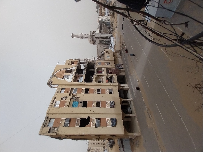 The image presents a scene of significant urban destruction in Khan Yunis, Palestinian Territory, under an overcast sky. A multi-story, light-colored building, approximately six to seven floors high, dominates the left-center, displaying extensive structural damage including large missing sections of its facade, exposing interior rooms and floors. Numerous punctures and irregular openings are visible across its exterior, and the roofline is heavily compromised. A black vehicle is partially visible parked within a ground-level archway of this damaged building. A two-lane paved road, marked by white lines and partially covered in sand and debris, occupies the mid-ground. One individual, dressed in light attire, walks along the center of this road, moving away from the viewer. Two other individuals are positioned near the left curb, appearing crouched or seated next to the damaged building. In the background to the right, a white mosque with a tall, slender minaret stands amidst rubble and visible damage to its adjacent structures, indicative of widespread destruction beyond. The immediate right foreground is partially obstructed by a dense cluster of tangled dark wires and cables.