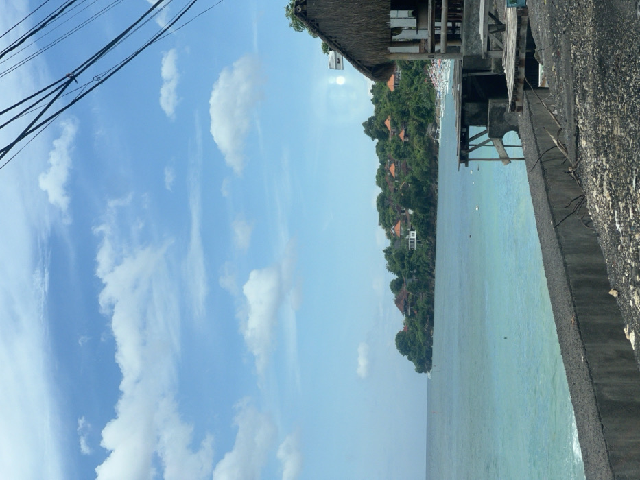 A coastal scene features a turquoise sea meeting a rugged, concrete embankment. Verdant trees dotted with terracotta-roofed houses rise up the landscape, topped by a thatched-roof structure. The sky above is a gradient of blue, marked with scattered white clouds. Power lines cut across the upper left corner of the frame.