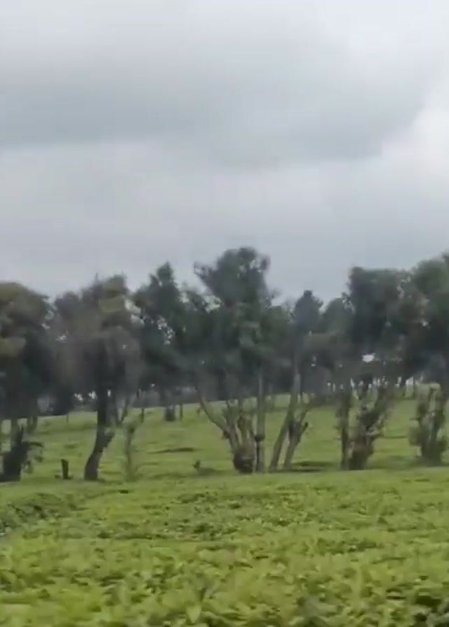 green field with trees, possibly a tea plantation. The trees are swaying in the wind under a cloudy sky. The camera is moving. There is a lot of wind noise.