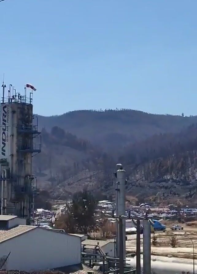 The video appears to be taken from a moving vehicle, possibly a car or train, showing an industrial area against a backdrop of hills or mountains. In the foreground, there is a chain-link fence, a gray building and some industrial equipment, including large white tanks and a tall tower with the name "INDURA" visible on its side. The background shows what seems to be an area of hillside, potentially scorched by fire. The sky is clear and blue. The camera pans slightly to the right, maintaining focus on the industrial plant as it moves past. Power lines are visible stretching across the top of the frame.