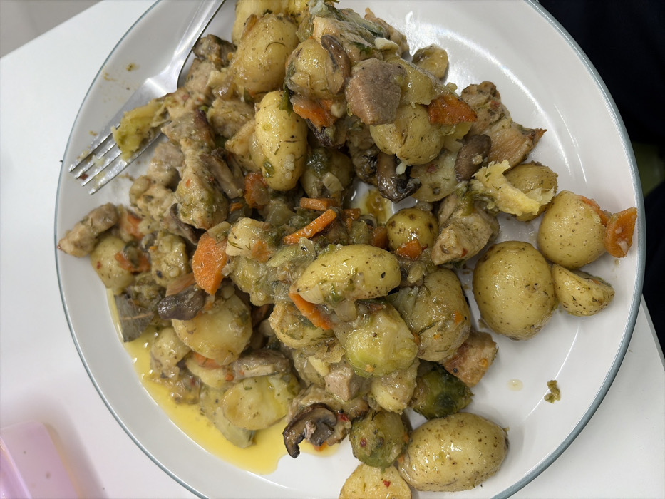 A full plate of food features small, whole potatoes coated in a dill-like sauce alongside sliced carrots, mushrooms, and bite-sized pieces of meat. The potatoes are a light yellow, some slightly broken apart, with a glistening sauce. Some brussels sprouts are scattered within the meal. A silver fork rests on the edge of the plate. The plate has a white surface with a thin, dark border.