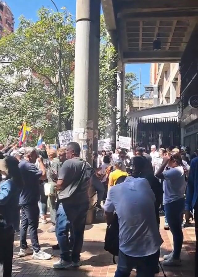 crowd of people gathered on a city sidewalk under a bright, sunny sky. The crowd consists of people of varying ages, dressed in casual clothing. Many of them are holding Venezuelan flags and signs with printed messages. The crowd appears to be protesting or demonstrating, as they are chanting loudly. The camera is positioned on the sidewalk, looking through the crowd towards a street. There are tall buildings and trees in the background, and a large concrete column is prominently visible in the foreground. Several individuals appear to be taking photos or videos of the event.