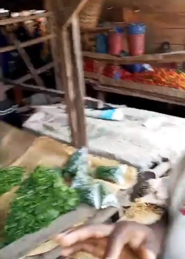 interior of a simple market stall, likely in an outdoor setting. In the foreground, there is a pile of fresh green vegetables, seemingly leafy greens or herbs. The stall itself is constructed with wooden beams and posts, and has a corrugated metal or similarly rustic roof with holes that let in light. The stall is stocked with various items, including what appear to be buckets or containers, possibly containing food or other goods. There are people visible further back in the stall area, though they are somewhat obscured by the structure. The overall impression is of a modest, somewhat cluttered market stall environment. The camera pans and is shaky.